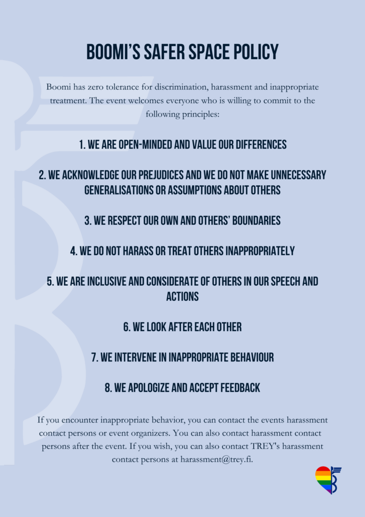 If we notice someone behaving inappropriately or otherwise violating the principles of a safer space, we intervene in the situation by calmly addressing the situation in way that is respectful to all parties. Intervening is everyone’s responsibility. However, we will only intervene if we feel safe to do so. We will not be reduced to bystanders – if we face harassment or discrimination, we take the matter to the appropriate channels and we do not hesitate to ask for help or support. Harassment contact persons, the events designated support staff and organizers along with the board of Boomi are there to support in every situation. A person guilty of harassment may be removed from the venue if necessary. Boomi’s harassment contact persons can be contacted at any point after the incident and they are there to discuss your experiences with confidentiality. The contact information of harassment contact persons can be found on Boomi’s website.